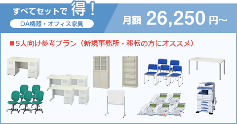 当社では、オフィス開業や移転時等の初期費用を押さえられるように、オフィス家具とOA機器を全てセットにした一括リースをご提供しております。